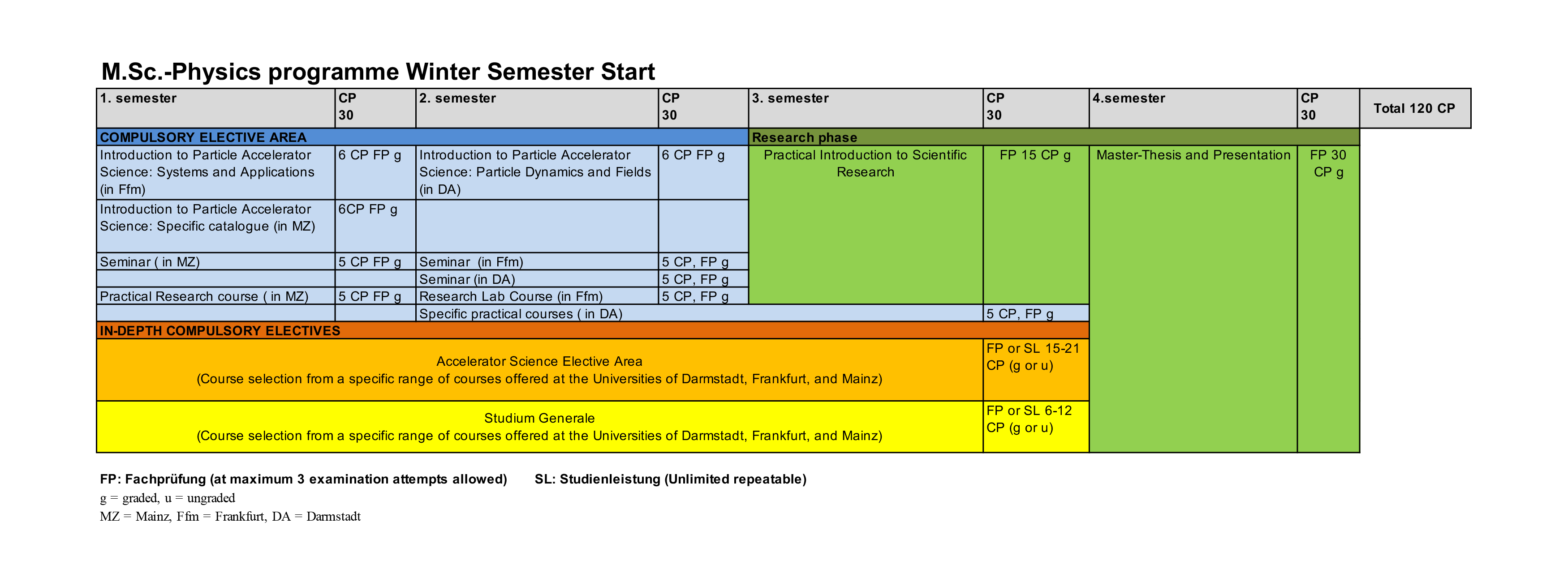 The M.Sc. study program “Particle Accelerator Science” is an English-language cooperative program between Technical University of Darmstadt (TUDa), Johannes Gutenberg University Mainz (JGU) and Goethe University Frankfurt am Main (GU) as part of the strategic alliance between the Rhein-Main Universities (RMU). In this program, the next specialist in Particle Accelerator Science is always no more than a one-hour train ride away.